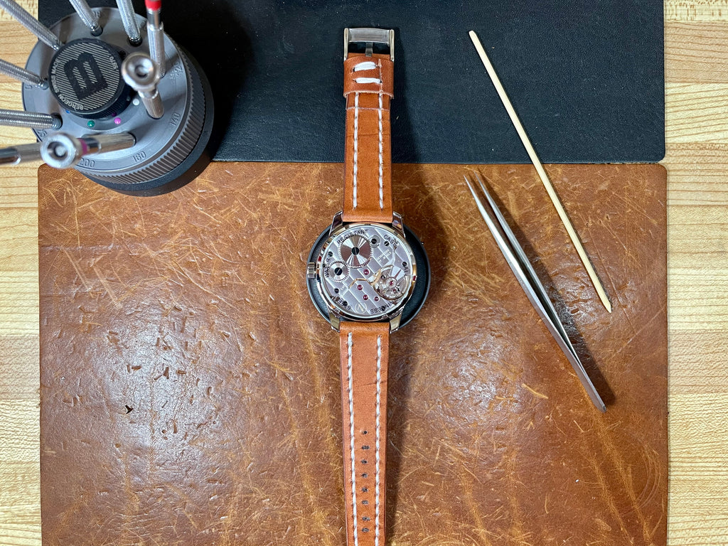 Dial: Live edge of the trolley track stamped using vintage Patek Philippe dial stamp.