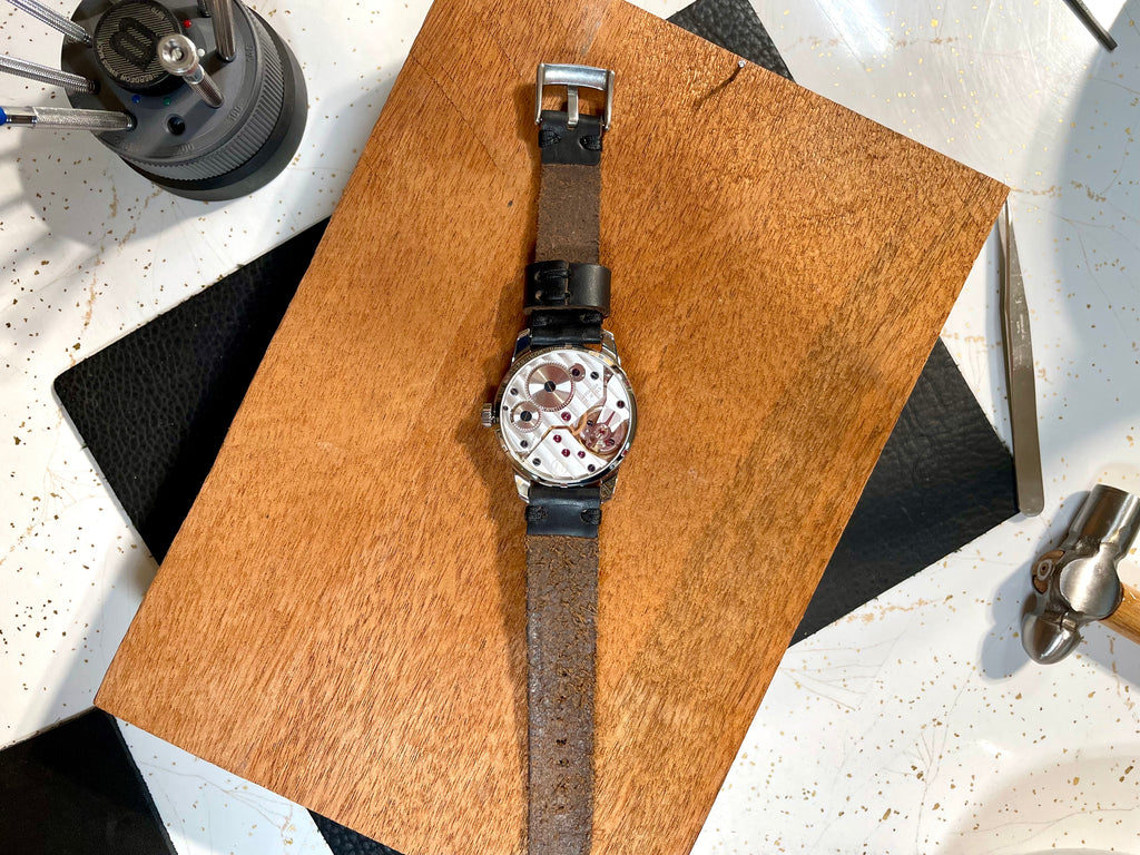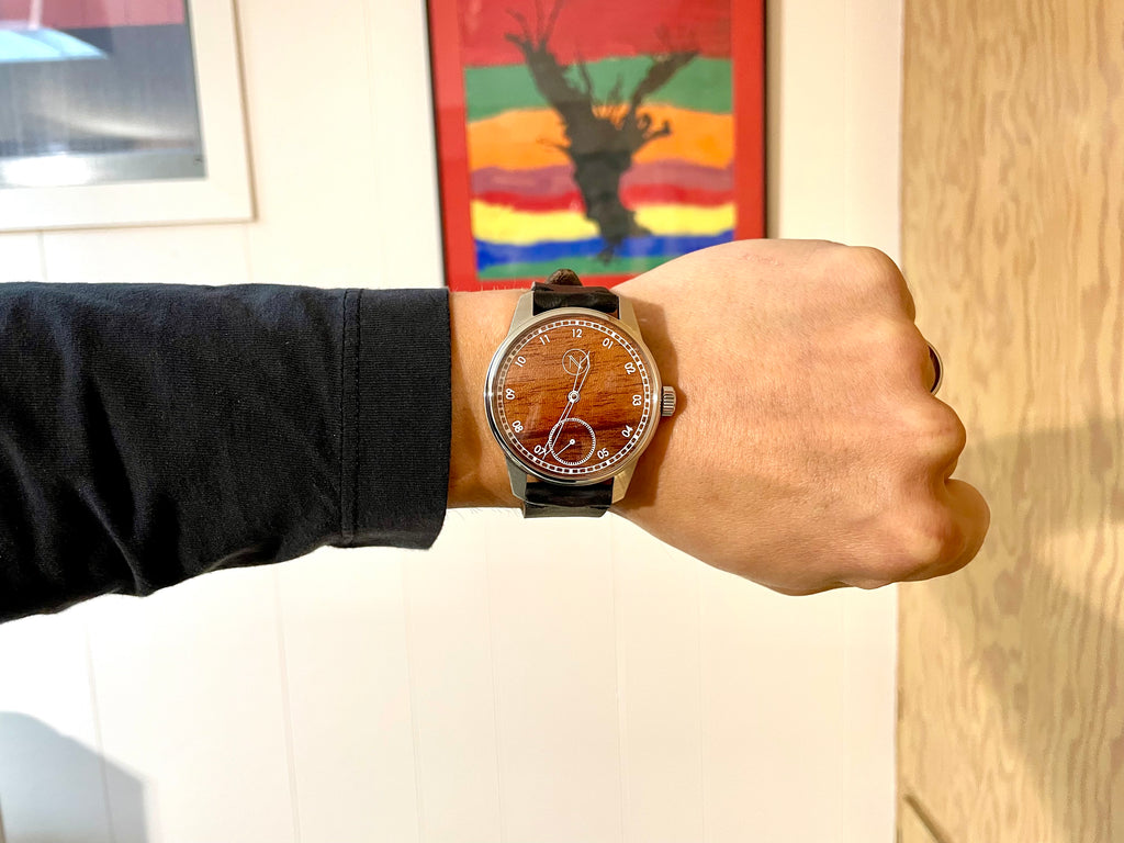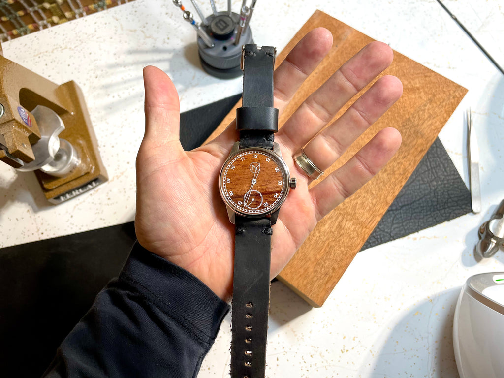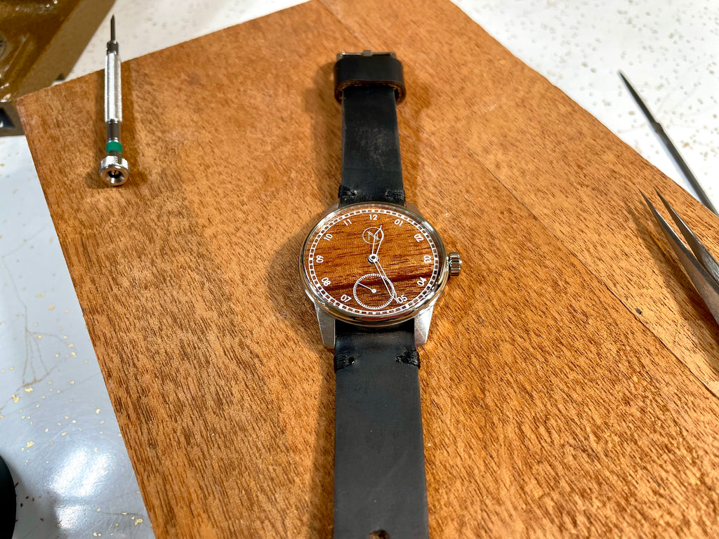 The dial of this one-off piece is made from a honduran mahogany provided to us by a custom guitar maker. We started by cutting the wold into fairly thin pieces but from there the rest of the crafting was done by hand. We sanded the dial down and then painted epoxy on the front and back multiple times. This process ensures the stability of the wood so it doesn’t crack over time.